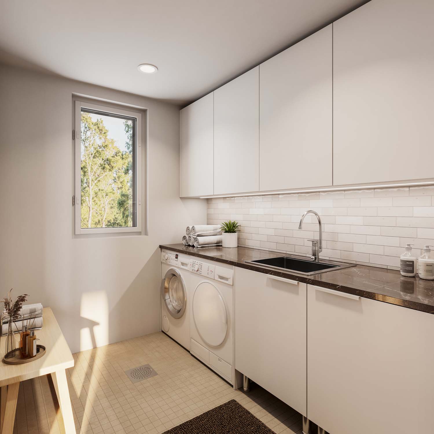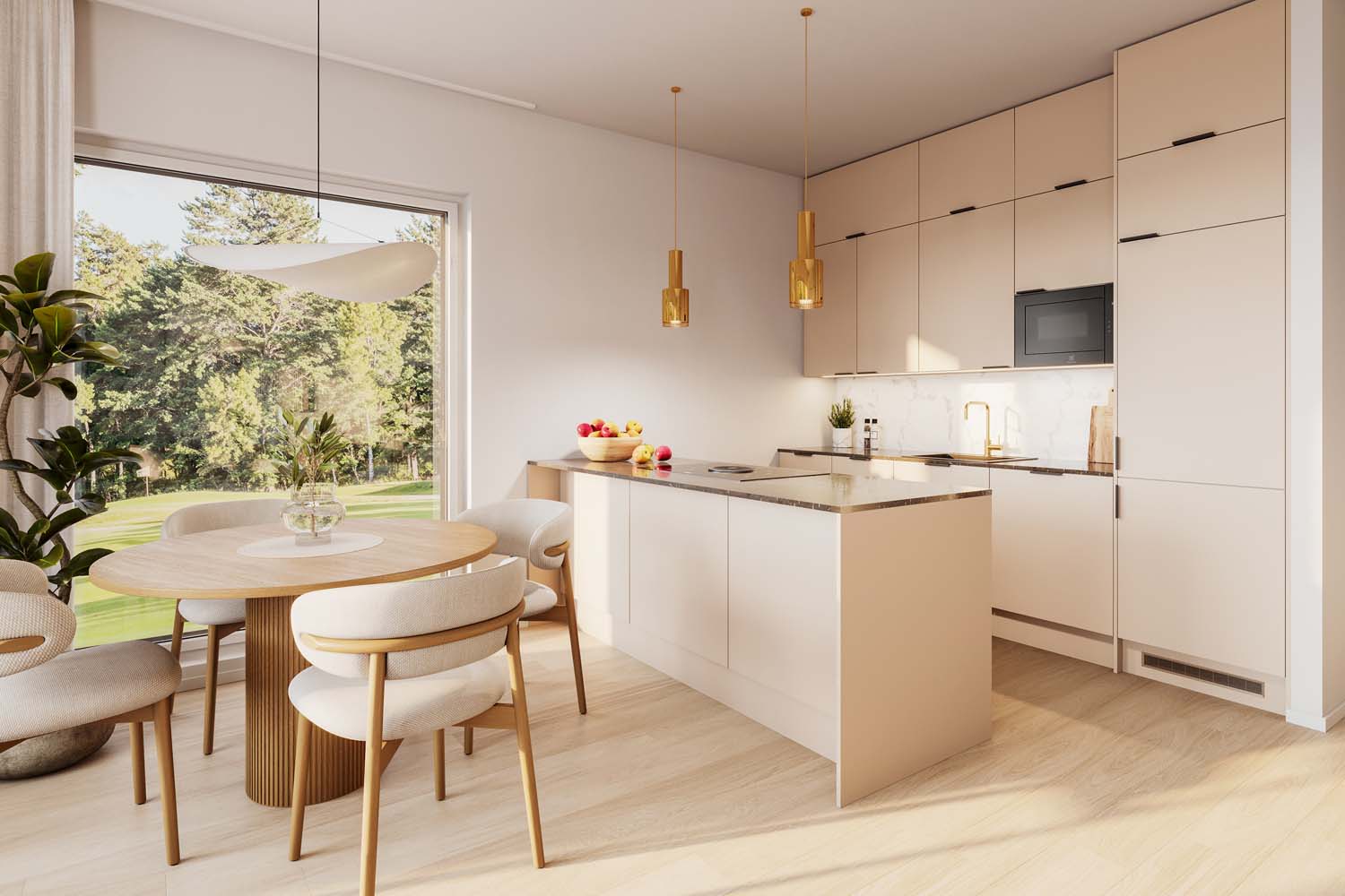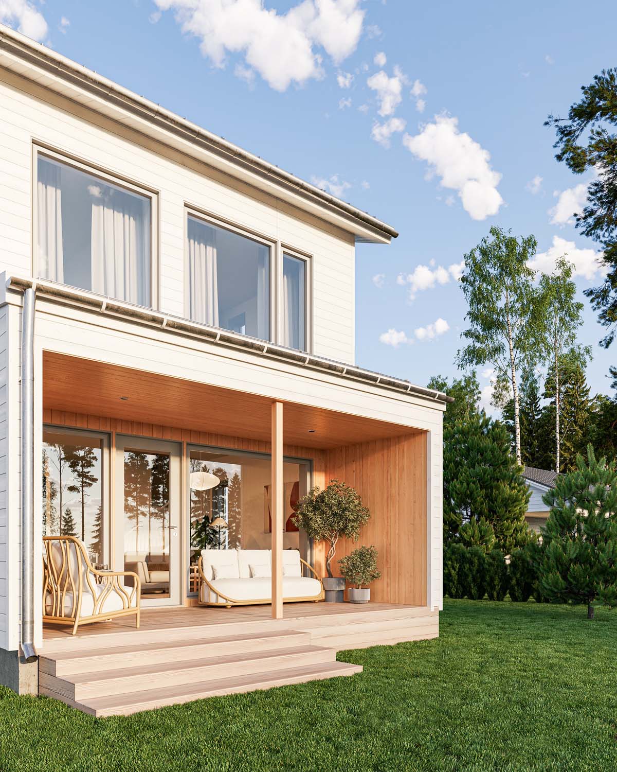 The result is a bright two-story home with three bedrooms, a spacious living and kitchen area, a separate utility room combined with a walk-in closet, a glass-walled sauna, and a separate WC. The exceptionally large yards and generous terraces of the geothermal homes extend the living space outdoors. With the support of our experts and a wide selection of colors, surface materials, and fixed furnishings, each resident can create a home that truly reflects their own style.