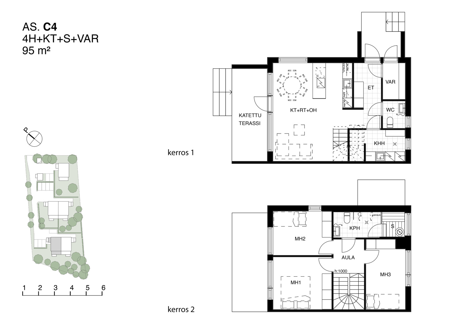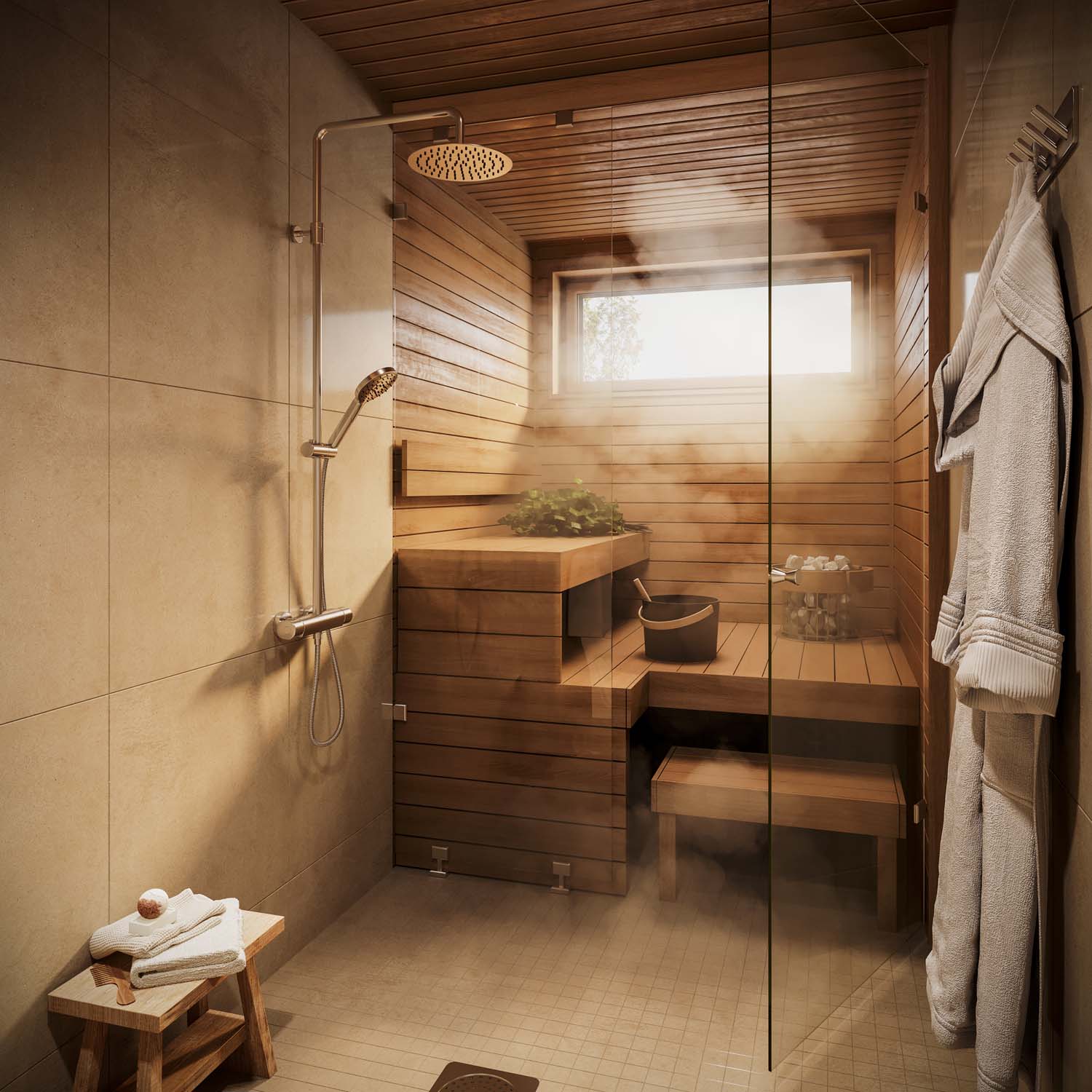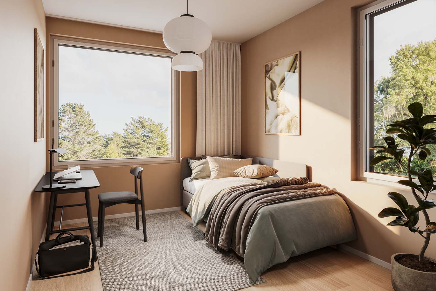 The result is a bright two-story home with three bedrooms, a spacious living and kitchen area, a separate utility room combined with a walk-in closet, a glass-walled sauna, and a separate WC. The exceptionally large yards and generous terraces of the geothermal homes extend the living space outdoors. With the support of our experts and a wide selection of colors, surface materials, and fixed furnishings, each resident can create a home that truly reflects their own style.