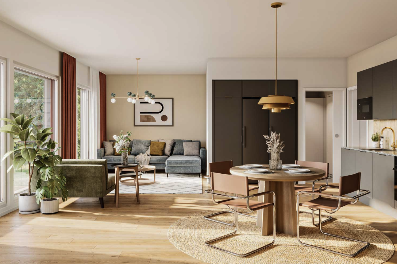 The apartments for sale in Vantaan Pensasmustikka are being built in the low-rise residential area of Ylästö, which offers an excellent foundation for a comfortable everyday life. The peaceful surroundings, comprehensive services, and prime location make living in this new development smooth and enjoyable. The semi-detached homes and the detached house feature high-quality natural materials, flexible layouts, and high ceilings that create a spacious and homely atmosphere. These single-level geothermal homes adapt to different life situations and preferences with individualized choices of colors, surface materials, and fixed furnishings.