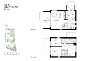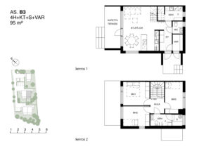 The result is a bright two-story home with three bedrooms, a spacious living and kitchen area, a separate utility room combined with a walk-in closet, a glass-walled sauna, and a separate WC. The exceptionally large yards and generous terraces of the geothermal homes in Lintulehto extend the living space outdoors.