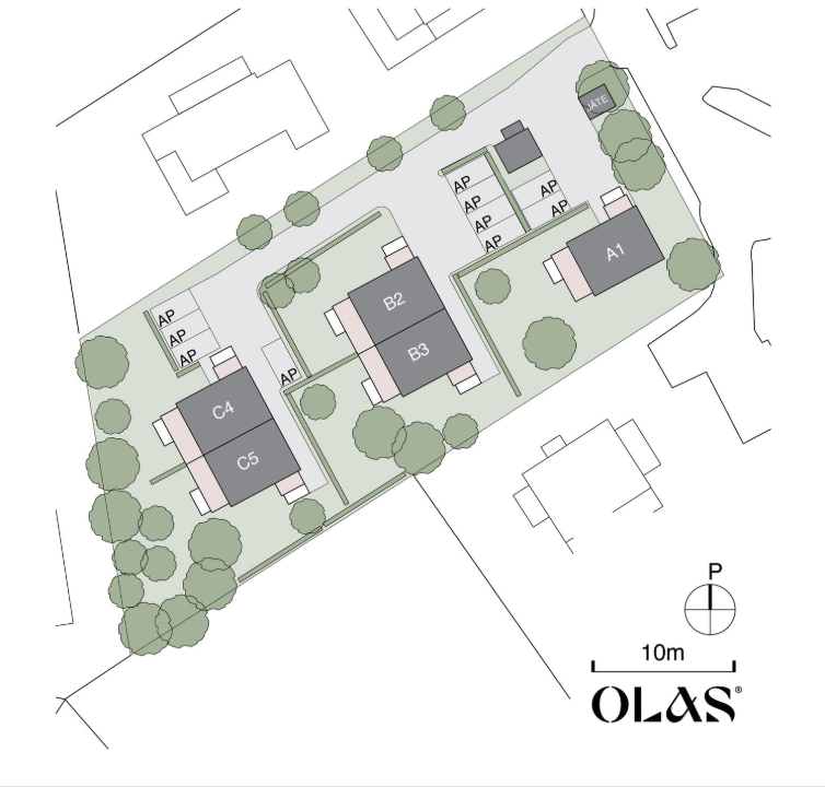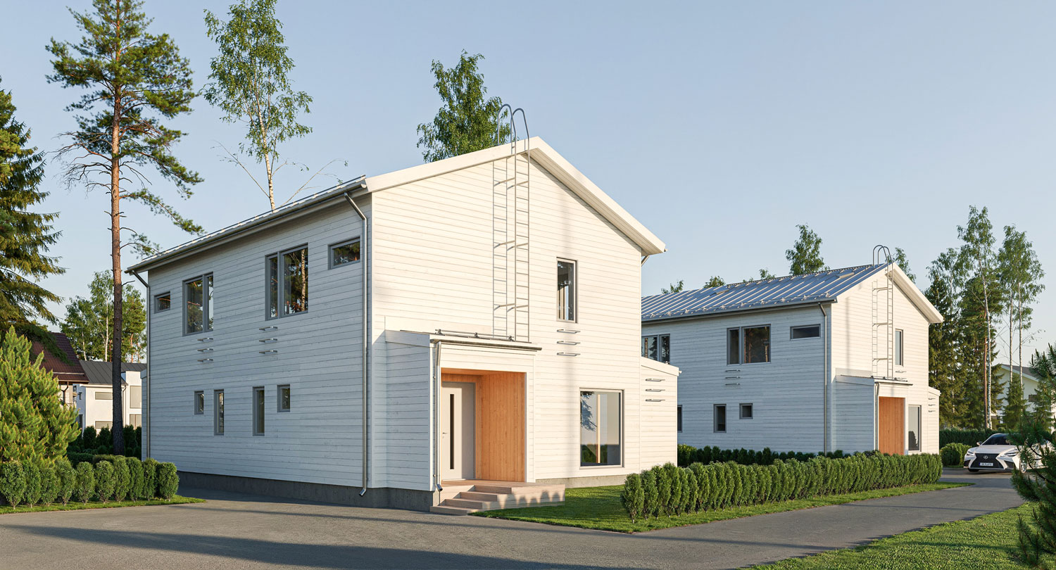 Espoo Lintulehto consists of four two-story semi-detached homes and one two-story detached home. The design of these homes emphasizes durable and high-quality choices – such as solar panel readiness, parquet floors, frameless windows, and integrated dishwashers.