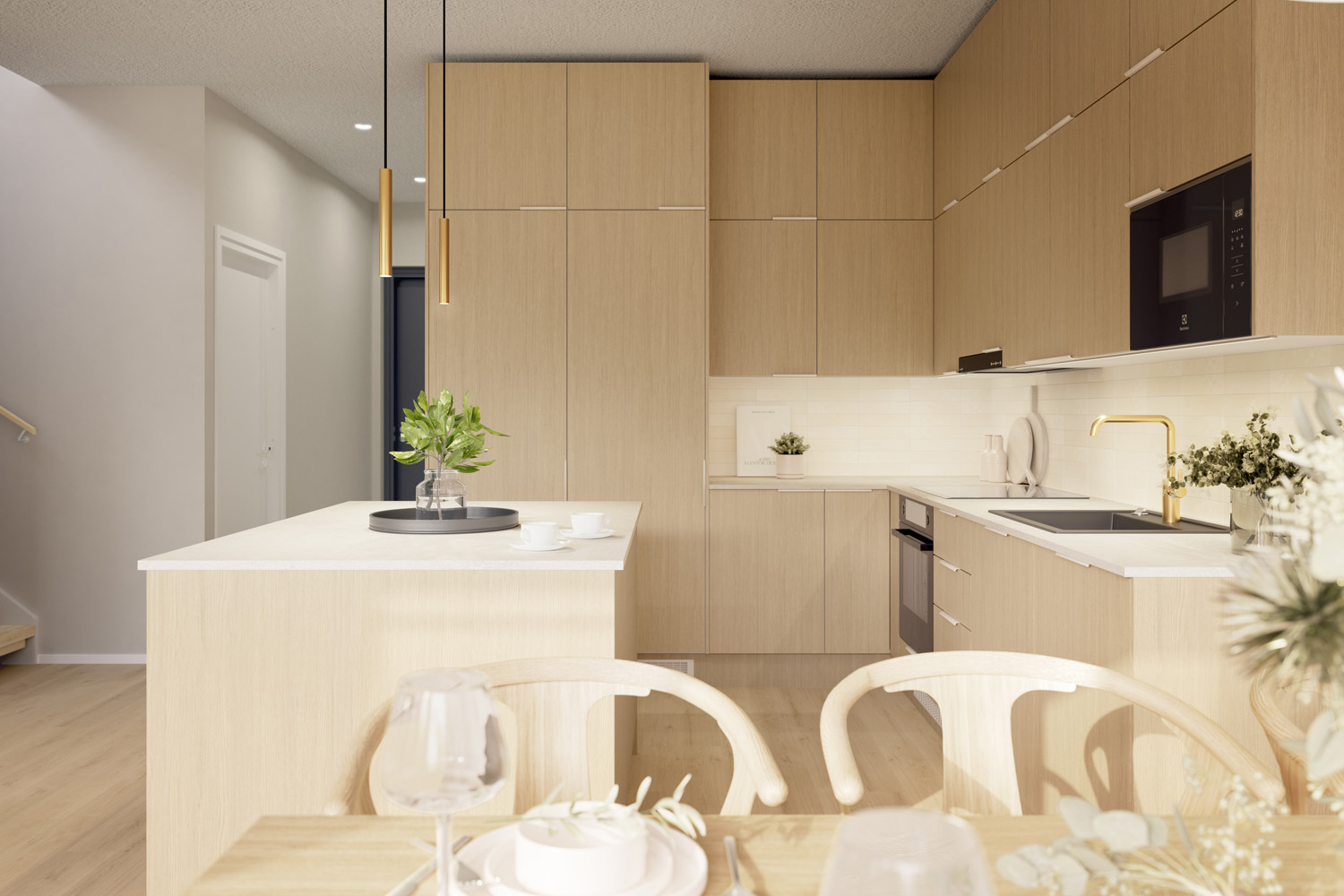 The apartments for sale in Helsingin Tammimetsä are located in the nature-rich area of Kuninkaantammi. The new development consists of nine two-story row houses built from northern wood. The geothermal homes feature bright rooms, a spacious terrace, a separate storage room, and high-quality materials that make everyday life smooth and enjoyable. The colors, surface materials, and fixed furnishings of each home are chosen according to the resident’s preferences.