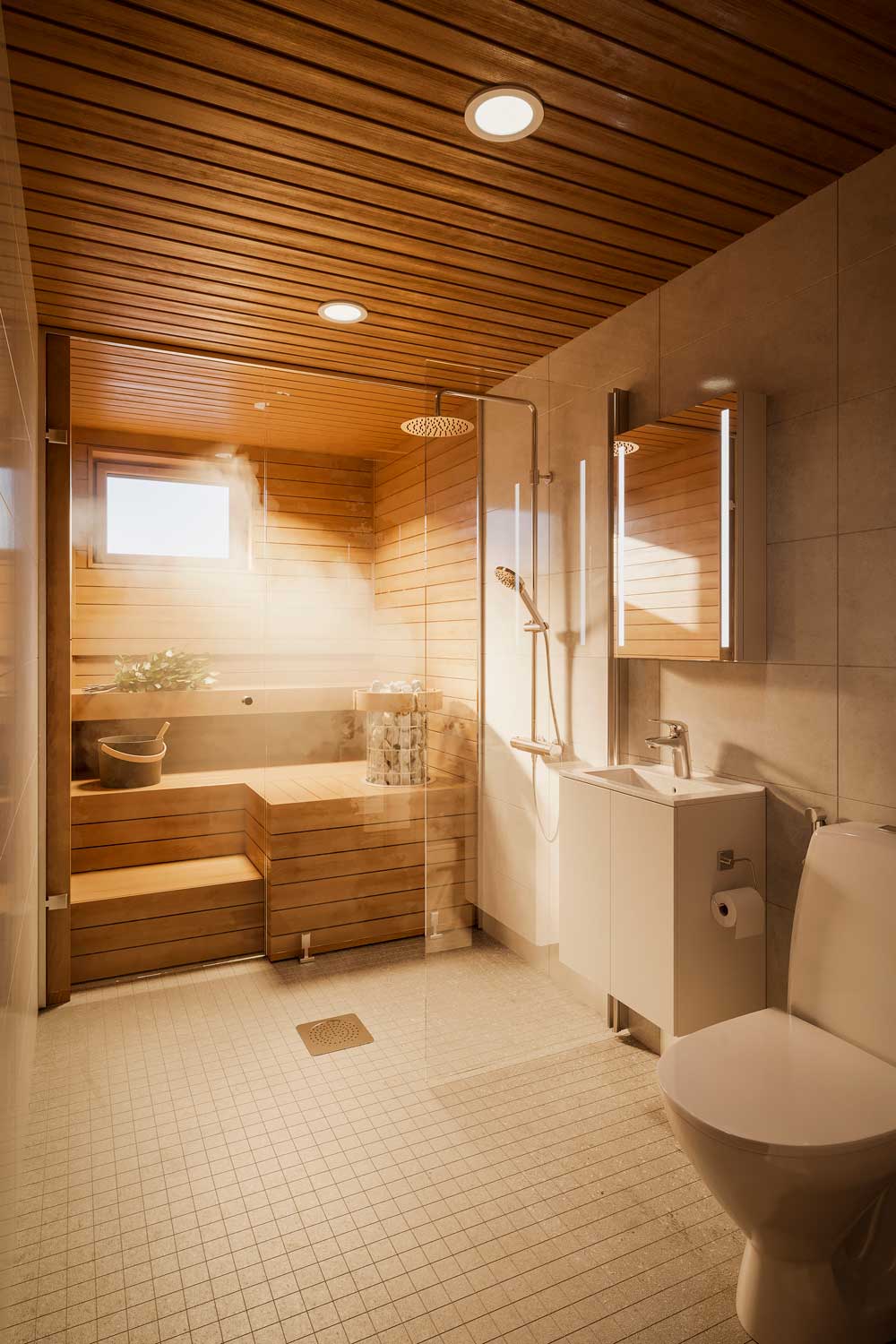 • A handcrafted wooden sauna with a spa-like glass wall ensures gentle and relaxing sauna moments