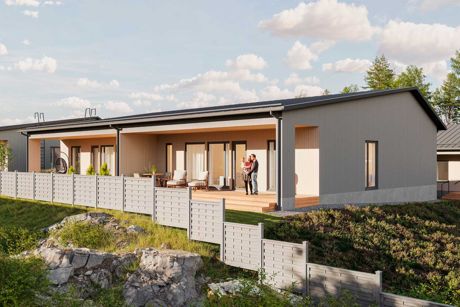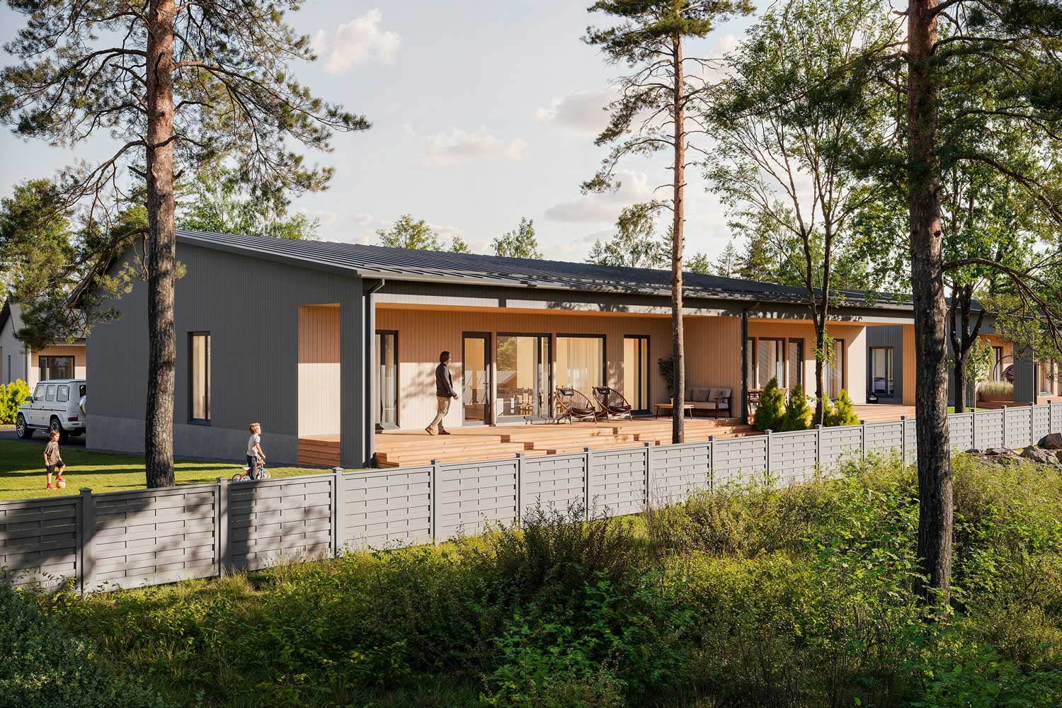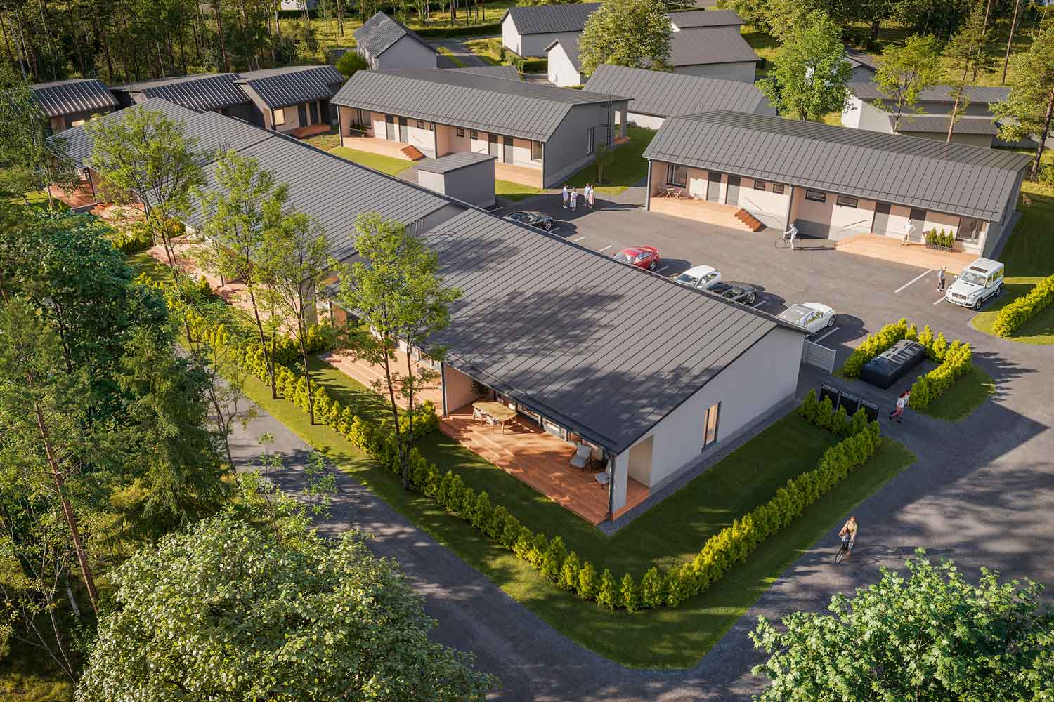 Vantaan Metsämansikka consists of ten single-level semi-detached homes. Designed by renowned architect Pet Michael, these geothermal houses represent the very best of modern Scandinavian wooden construction. Every detail of the semi-detached homes is crafted to make everyday life a little better and more functional. Our experts have selected a comprehensive range of colors, surface materials, and fixed furnishings, enabling each home to be shaped into one that truly reflects its residents.